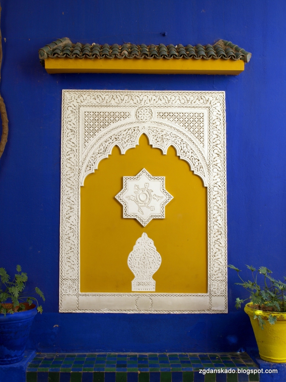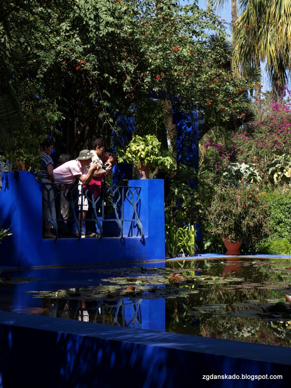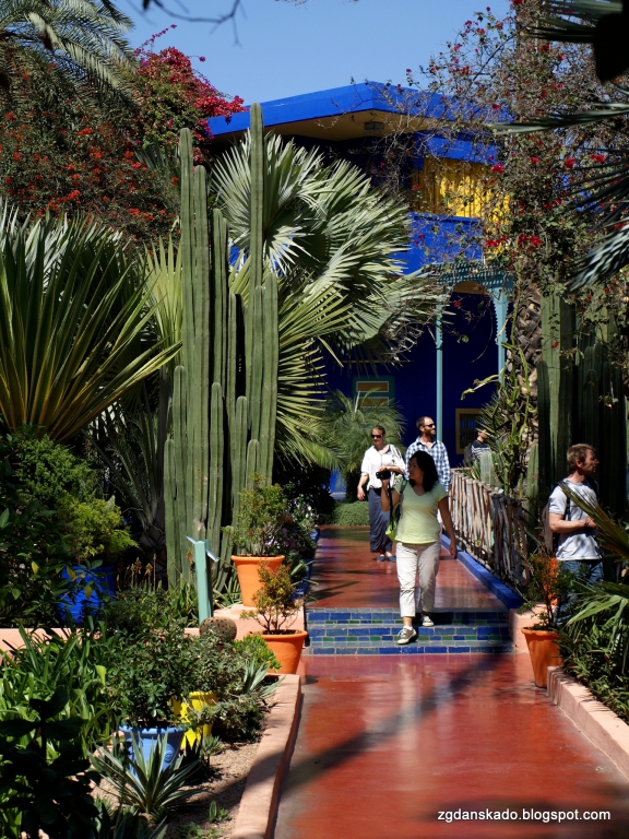 Trochę rozczarowani pierwszym kontaktem z ogrodami postanowiliśmy się nie poddawać i pójść za ciosem. Kolejnym ogrodem, do którego zawitaliśmy był słynny Jardin Majorelle. Jest to miejsce zrobione typowo pod turystów, wstęp z tego co pamiętam kosztował nas 50 dh (20 zł). Dosyć sporo jak na marokańskie warunki, biorąc pod uwagę fakt, że do tej pory płaciliśmy za wstępy do kazb czy szkół koranicznych przeważnie 10 dh (4 zł). Było jednak warto kupić bilet.